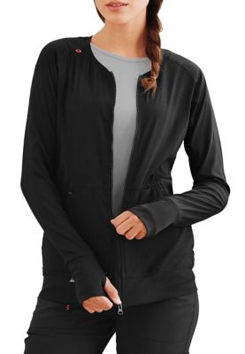 | FIND YOUR CLARITY The Clarity twoway zip front scrub jacket from Koi Lite is constructed of polyester dobby stretch fabric for just the right amount of stretch and warmth Thumbhole sleeves and rib knit cuffs and hem provide extra coziness Two curved front pockets plus contrast bungee loop cord and clip provide places to store and secure your essentials Koi Lite Clarity Ribbed Panel Scrub Jackets 2way zip closure 2 angled side pockets Princess seams Koi Lite grosgrain ribbon tape inside back collar Thumbhole sleeve Contrast clip bartacks utility cord and loop 100 polyester dobby stretch rib 92 polyester8 spandex Medium center back length 26 58 Koi Item 445