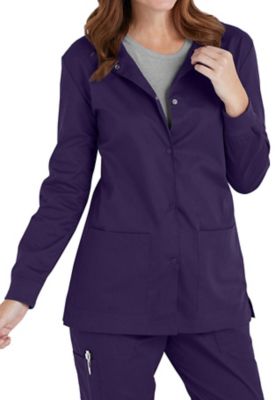 | SHAPING WARMUP No more shapeless outerwear This All Day warmup scrub jacket by Landau features back darts at the waist for contour as well as a jewel neckline snap closure and knit cuffs Two large pockets are roomy enough to warm up hands or stash medical accessories for work on the go Landau All Day 2Pocket Scrub Jackets Jewel neckline Snap closure 2 topentry pockets Back waist darts Side slits Medium center back length 28 38 65 polyester35 cotton Landau Item 3507