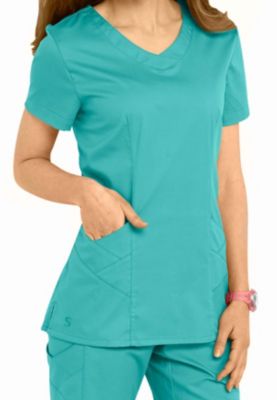 | This scrub top from Landau will make for an essential addition to your wardrobe The Bliss stretch scoop neck tee has a rounded overlapping vneckline great detailing and a flattering fit Pair with the Bliss cargo pant style 2014Landau Bliss Stretch Scoop Neck Scrub TopsFront and back waist dartsTwo deep top entry pocketsBasket weave seaming detail on the pocketsNotched sleeve hem detailSide slitsMade of 52 cotton 45 polyester and 3 spandexMedium Center Back Length 25 58