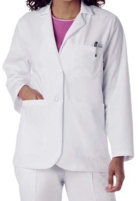 | Ladies twobutton consultation length lab coat with lapel Three outside pockets and two lower inside pockets Medium Center Back Length 285 6535 Poly Cotton See why Landau is Made Better Better Fabric Landau Care Instructions